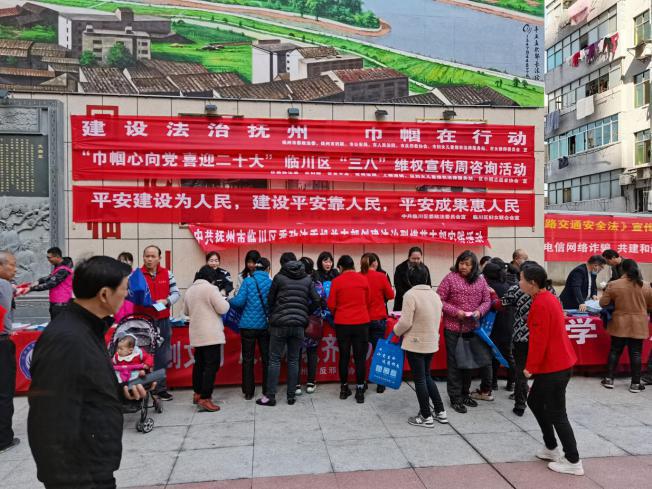抚州市抚州市妇联联合市政法委、市法院、市公安局等单位,组织市妇女儿童维权法律服务站成员、巾帼维权志愿者等在临川区上顿渡镇老街开展普法宣传。南丰县妇联、县法院组织家事法官和巾帼志愿者们走进南丰县洽湾船型古镇开展以案释法宣讲活动。黎川县妇联联合县法院在孔庙广场开展“三八”维权周普法宣传活动。黎川县纪委县监委联合华山镇妇联在华山镇举办趣味法律知识竞赛,在新时代文明实践所开展普法活动。广昌县妇联联合县委政法委、县法院、县检察院、县公安局、县司法局、驿前镇等多家单位开展女性和未成年人社区矫正对象教育帮扶活动。广昌县妇联联合县法院组织“党建+妈妈法庭”干警赴旴江镇为100余名妇女群众送去《家庭教育促进法》专题普法讲座,引导妇女群众“依法带娃”。临川区妇联联合区政法委、总工会、司法局等相关部门,组织妇女儿童维权法律服务站成员、巾帼维权志愿者在临川老街开展“三八”维权周普法维权集中宣传活动。乐安县妇联、东乡区妇联、南城县妇联、崇仁县妇联、宜黄县妇联、金溪县妇联分别联合当地县委政法委、法院、公安局、司法局、卫健委、市管局、人社局、教体局、住建局、团县委等相关单位在当地广场开展“三八维权周”普法宣传活动。