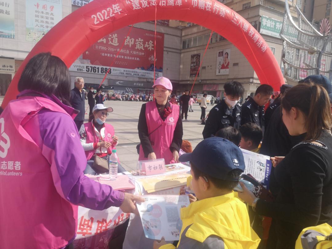 鹰潭市鹰潭市妇联联合司法、法院、检察院、公安、人社、卫健、残联、医保等20多部门在时代广场举行2022年“建设法治鹰潭•巾帼在行动”三八维权周主题宣传活动。通过展示宣传标语、设置咨询台、发放宣传资料等方式进行宣传,当天活动共发放宣传资料、宣传品1000余份。
