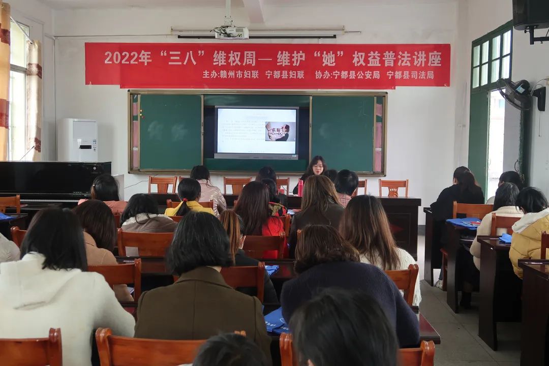 赣州市赣州市妇联联合宁都县妇联在宁都县固厚乡开展“三八”维权周—维护“她”权益普法讲座。赣州市妇联联合章贡区妇联、区政法委、区司法局等部门在高新区赣州国家高层次人才科创园活动广场开展“三八”维权周法治宣传志愿服务活动进企业活动。崇义县、于都县、安远县等妇联开展“三八”维权周普法宣传知识讲座进农村(社区)、进机关活动,龙南市妇联以乡间夜话形式,向妇女群众宣传妇女权益相关法律法规知识。