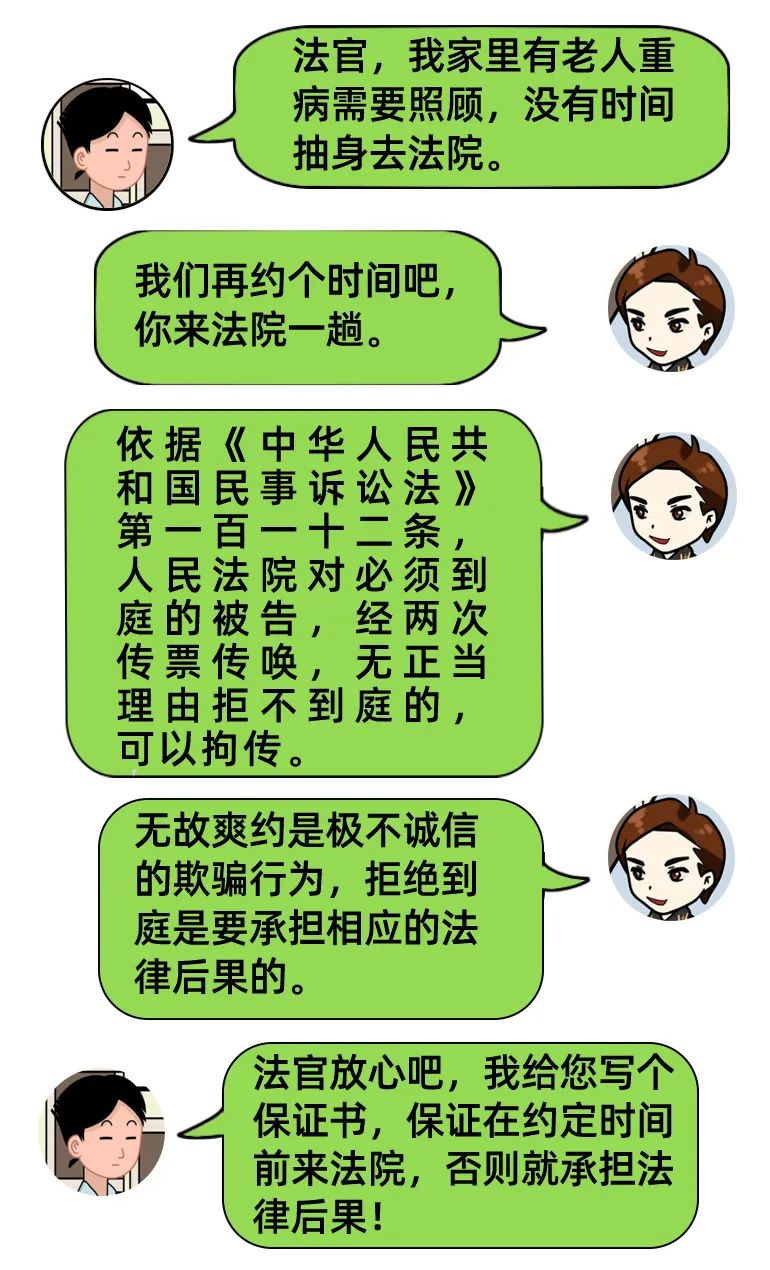 “法官,我写保证书,我保证来法院!” 法官:被执行人,你人呢?