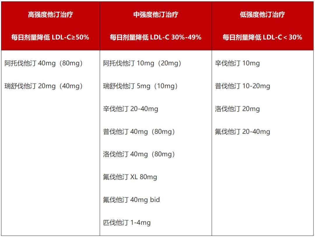 《2018美国心脏病学会(ACC)/美国心脏协会(AHA)血液胆固醇管理指南》将每日剂量降低LDL-C≥50%的治疗定义为高强度他汀治疗;每日剂量降低LDL-C 30%-49%的治疗定义为中强度他汀治疗;每日剂量降低LDL-C<30%的治疗定义为低强度他汀治疗。在高强度他汀治疗过程中患者可以考虑联用依折麦布或依洛尤单抗,以取得更好的降脂效果。