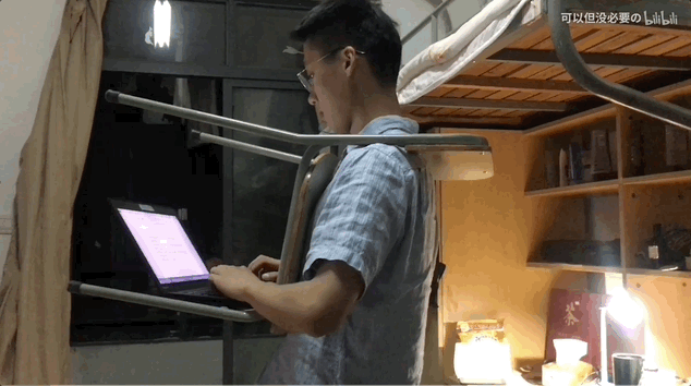 这样做有两个优势,一是绝对不会犯困。二是为了保证电脑不会掉下去,他的双手得始终压在键盘上,无法抽空玩手机。