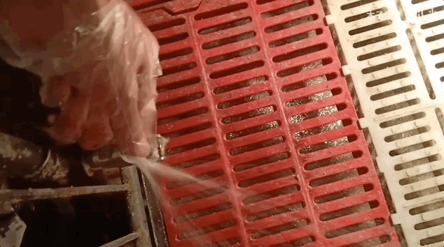 小猪的保育床由网状塑料制成,粪便可以直接落到下方,保证了猪圈的干净整洁。