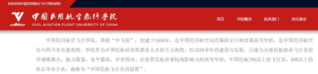 据中国民用航空飞行学院官网介绍,中国民用航空飞行学院,简称“中飞院”,创建于1956年,是中国民用航空局直属的全日制普通高等学校,是中国民用航空局与四川省共建高校。学院作为中国民航培养高素质人才的主力高校,经过60多年的建设与发展,已成为全球民航职业飞行员培养规模最大、能力最强、水平最高,享誉国内、在世界民航有着较高影响力的高等学府。