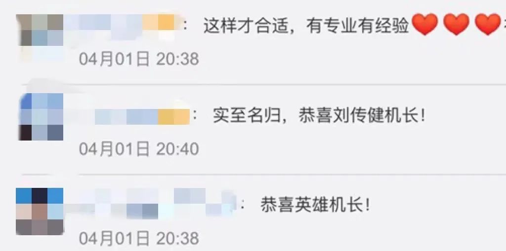 因在事故处置中的出色表现,刘传健荣获中国民航英雄机长、“最美退役军人”等荣誉称号,获全国五一劳动奖章。机组全体成员被授予中国民航英雄机组称号。对于此次履新,不少网友留言向他祝贺。