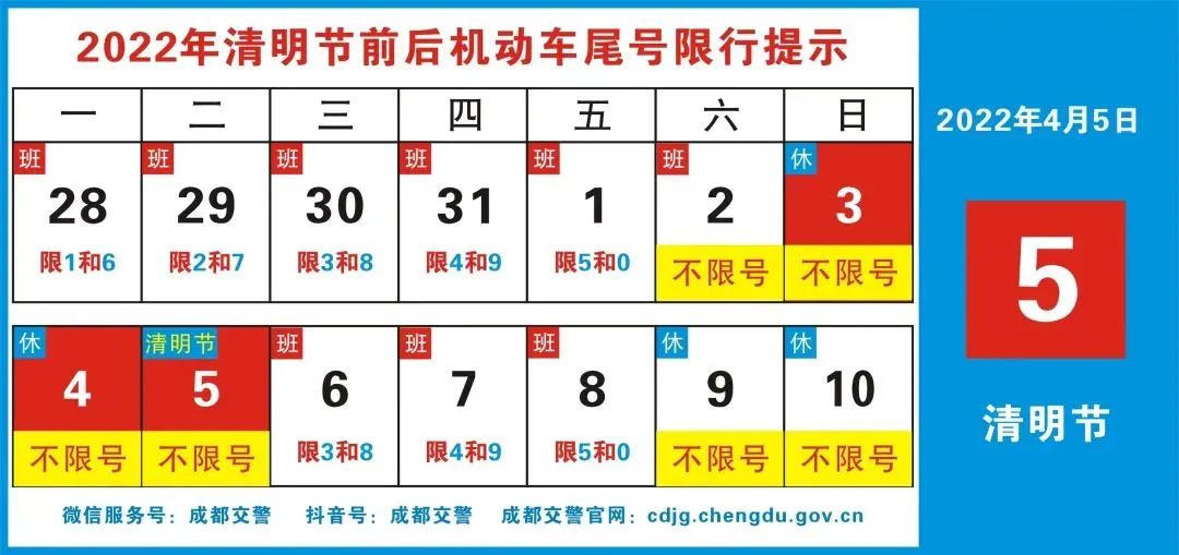 2022年清明节从4月3日开始,至4月5日结束,共计3天。另外,4月2日(星期六)为调休工作日,也不实施机动车尾号限行措施。