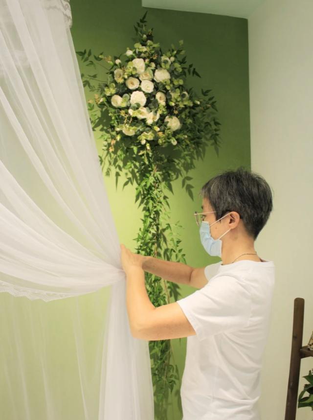 告别特殊的家人暖白与墨绿为基调的房间,正中间沿顶垂下的白纱幔围成帘子,两边挂着干花花束,这是宠物殡葬机构“芳草地”一间告别室的装潢。在这里,Allen和他的团队会为离世的小动物祷告,通过一个小小的悼念会,让宠物的主人和自己的爱宠好好作一次离别。