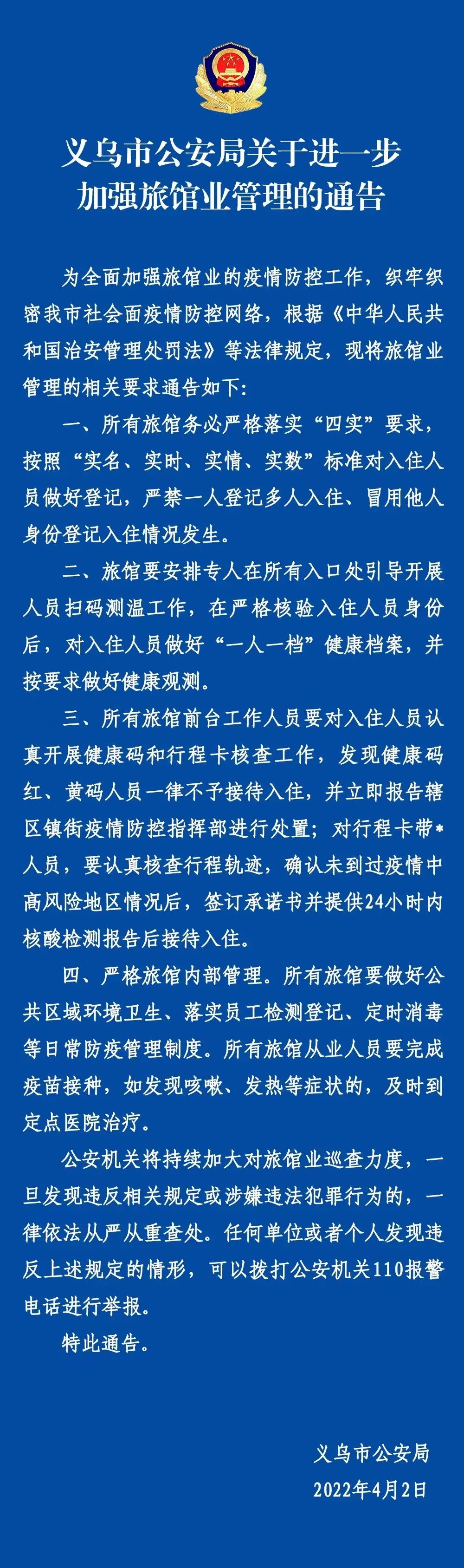 原标题:《义乌市公安局关于进一步加强旅馆业管理的通告》