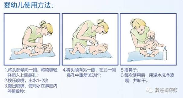 由于婴幼儿鼻腔粘膜娇嫩以及不能很好配合冲洗操作,因此整个鼻腔腔道的冲洗方式仅适用于成人和四岁以上儿童,四岁以下儿童建议使用的是生理性海水盐鼻腔喷雾器,而不用冲洗器。更小的宝宝如果喷雾器都不能很好配合,建议把棉签用盐水浸透后再去轻柔湿润鼻腔。
