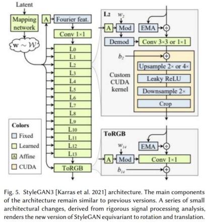 StyleGAN3 对生成细节的把控令人惊叹,它从根本上解决了 StyleGAN2 图像坐标与特征粘连的问题,实现了真正的图像平移、旋转等不变性,大幅提高了图像合成质量。