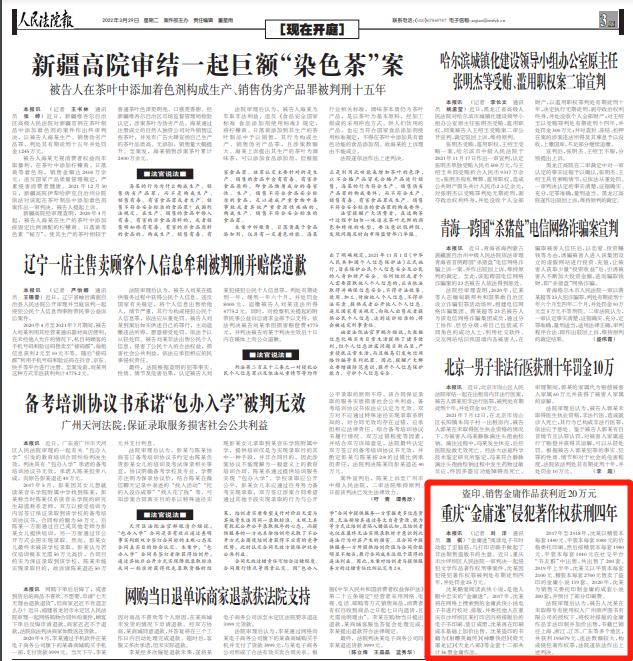 人民法院报:盗印、销售金庸作品获利近20万元 重庆“金庸迷”侵犯著作权获刑四年