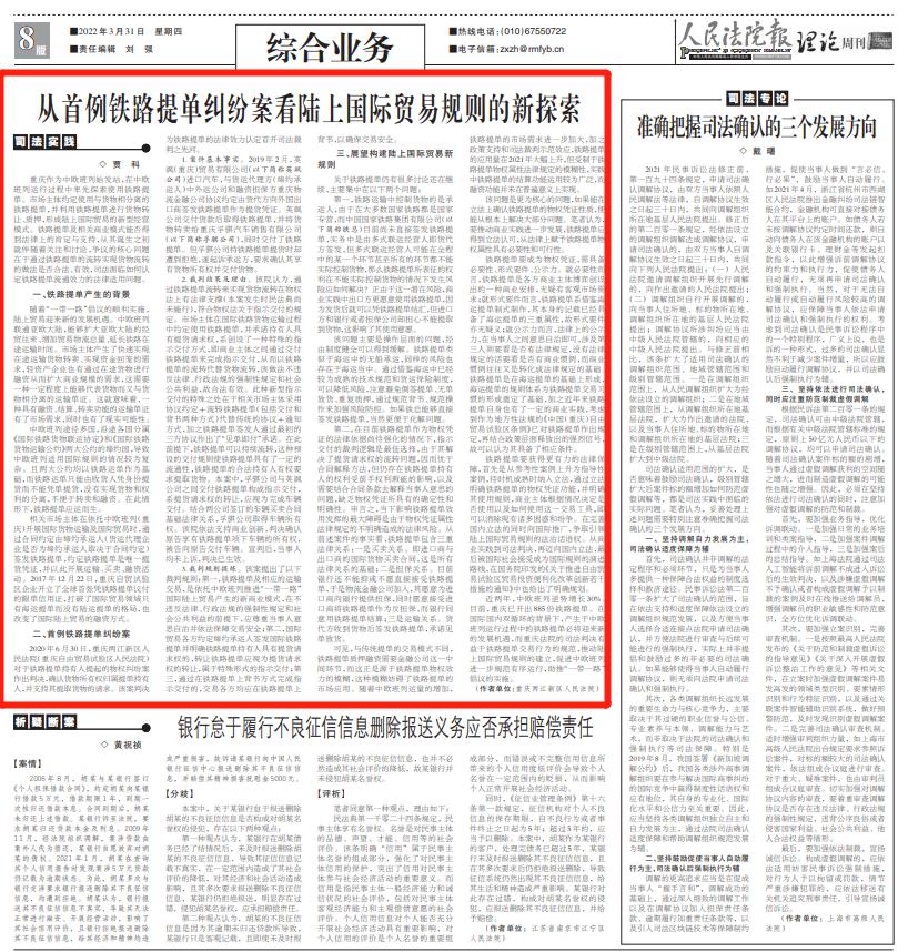 人民法院报:从首例铁路提单纠纷案看陆上国际贸易规则的新探索