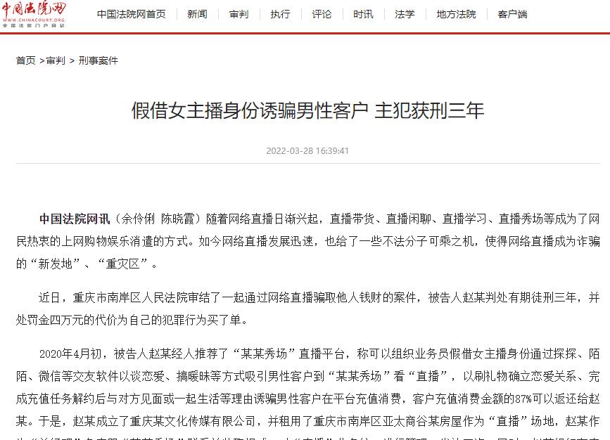 中国法院网、法治网:假借女主播身份诱骗男性客户 主犯获刑三年