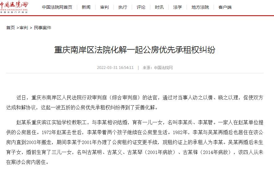 中国法院网:重庆南岸区法院化解一起公房优先承租权纠纷