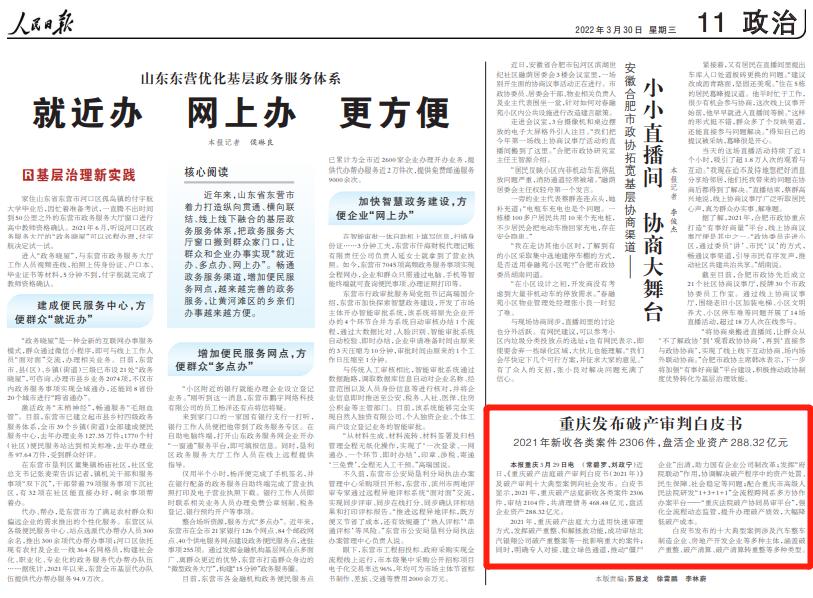 内容摘要:近日,《重庆破产法庭破产审判白皮书(2021年)》及破产审判十大典型案例向社会发布。白皮书显示,2021年,重庆破产法庭新收各类案件2306件,审结2104件,共清理债务468.48亿元,盘活企业资产288.32亿元。