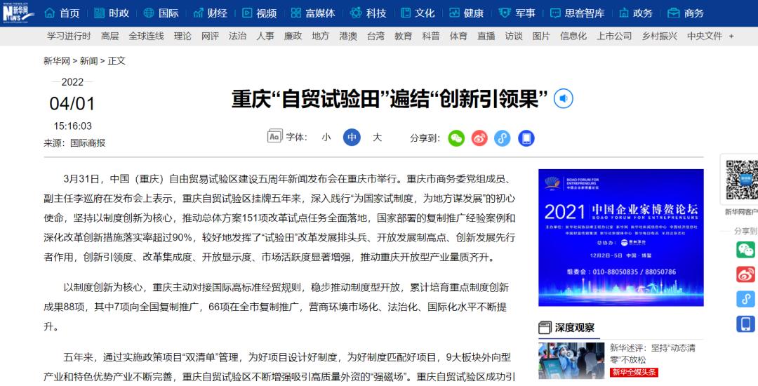 新华网、中国网、中国商务新闻网、重庆日报客户端、重庆发布、上游新闻、华龙网:重庆“自贸试验田”遍结“创新引领果”