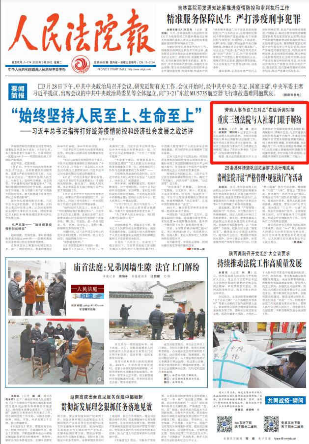 人民法院报:劳动人事争议“总对总”在线诉调对接 重庆三级法院与人社部门联手解纷