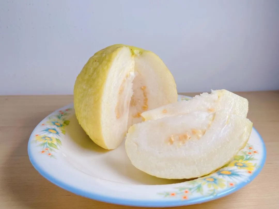 果皮转为黄色,成熟度高,味道香甜 | 作者 拍摄番石榴可以直接切开食用,不需要挖瓤去籽,如果磕到籽吐出来就好,就像吃西瓜一样。熟透的番石榴,瓜瓤才是最甜美最好吃的部位,口感香甜软糯。