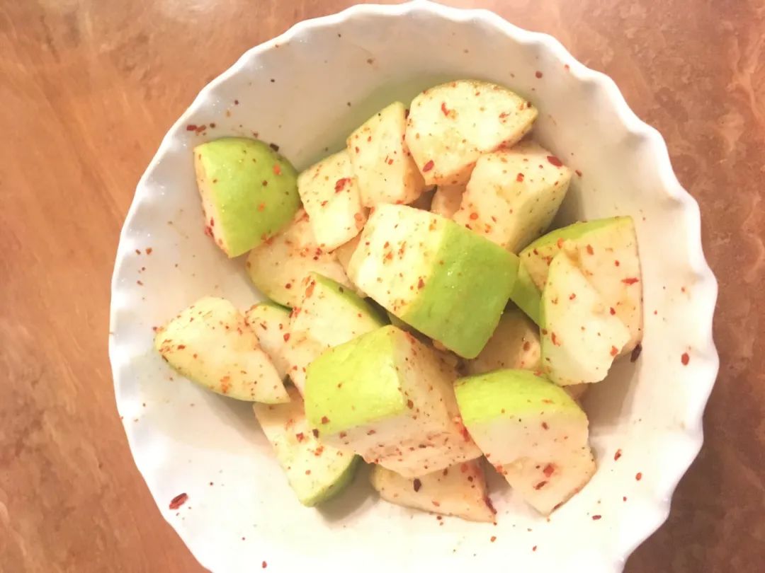 比较受欢迎的是辣椒盐蘸料。番石榴切块后撒入适量的辣椒盐,在盐分的作用下,番石榴稍微脱水,糖分浓度更高,而辣椒又减弱了番石榴本身的涩味。酸咸辣甜的味道,不但把番石榴本身的甜激活了,又增加了咸香口感,让人瞬间胃口大开,吃过才知有多上头。