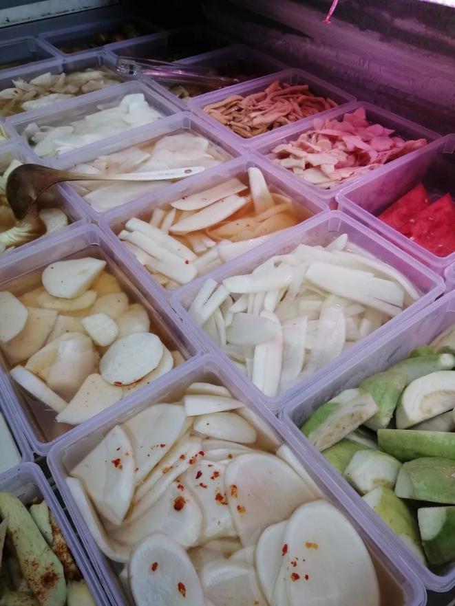 酸嘢是广西的特色做法,街边的酸嘢摊,整齐码放着种类丰富、色彩斑斓的蔬果,让人们看着赏心悦目又垂涎三尺。