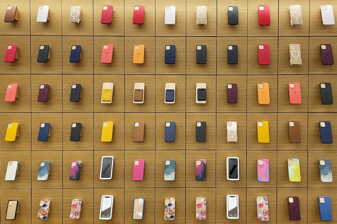 北京王府井苹果专卖店手机壳展示墙/视觉中国还有一类是手机配件品牌,如绿联、摩米士等,主打功能性和高品质的材质,价格中档,一般在200元以下,款式也较为简约。