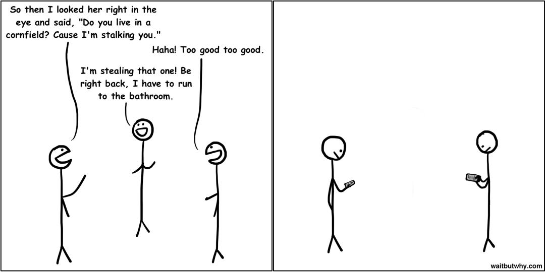 有一种东西我称之为永久追赶陷阱。当你很长时间没有见到一个好朋友时,第一件事就是追赶——你想知道他们的工作状况,他们的女朋友,他们的家人等等,他们想要赶上你的生活。从理论上讲,一旦发生这种情况,您就可以开始真正建立友谊。问题是,当你没有为好朋友腾出足够的时间时,只是为了吃饭而不是经常见到他们——最终每次聚会都在赶时间,而你实际上永远无法享受友谊或得到远远超出表面。这就是永远的追赶陷阱。