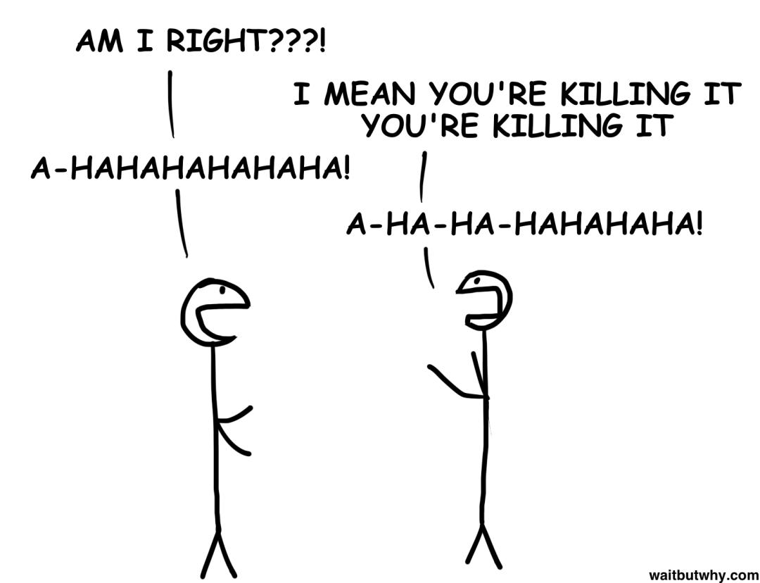这是一个害怕认真互动的朋友,因此,你们的友谊仿佛某种短剧——你们俩互动时,你必须时刻保持在线状态。有时这个短剧是你们俩一直嘲笑所有事情。他只能和你一起存在于“这太tm搞笑了,太好笑了!”模式,所以你必须始终处于某种讲笑话或讽刺的模式,否则他会变得社交恐惧。