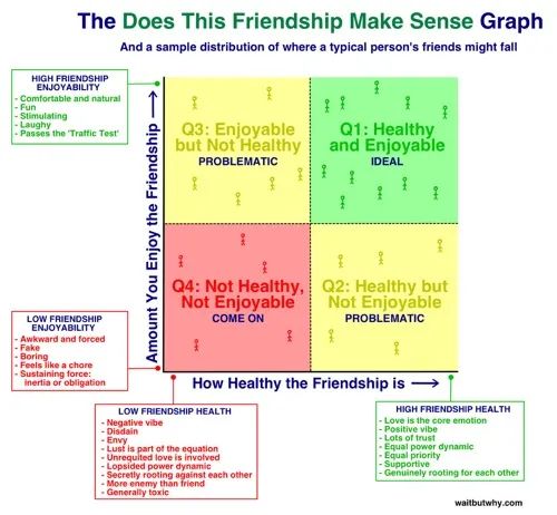 在“这份友谊真的有存在的意义吗”图中,我们刚刚讨论的友谊都在象限二、三或四中——即它们都有点不愉快、不健康,或两者兼而有之。这就是为什么情况一直令人沮丧。从好的方面来说,还有第一象限——所有有意义的友谊。没有友谊是完美的,但象限一中的人正在做友谊应该做的事情——他们让双方的生活变得更好。当友谊同时在图表的第一象限和山的第一层时。