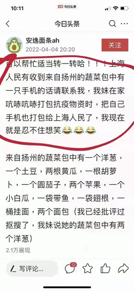 “可以帮忙适当转一转哈!!!上海人民有收到来自扬州的蔬菜包中有一只手机的话请联系我,我妹在家吭哧吭哧打包抗疫物资时,把自己手机也打包给上海人民了,我现在就是忍不住想笑!”4月4日晚上,一位网名“安逸面条ah”的网友发帖称,“来自扬州的蔬菜包中有一个洋葱、一个土豆、两根黄瓜、一根胡萝ト、ー个圆茄子、两个苹果、一个小白瓜、一袋带鱼、一袋翅根、一桶挂面、两个面包(我已经批评过抠搜了,我妹说她的蔬菜包中有两个洋葱)。”