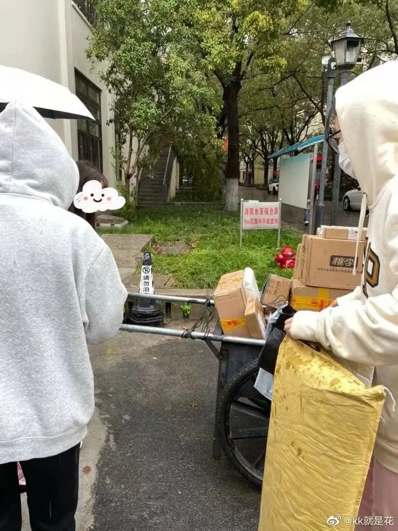 @kk就是花:坐标虹口校区,这天突然天降大雨,志愿者和老师们一把“薅”上帽子,就推着满载着快递的小车车去往各个楼层,为同学们送上已消杀完毕的快递们,他们身上淋湿了也毫不在意,那一刻心里太暖了❤