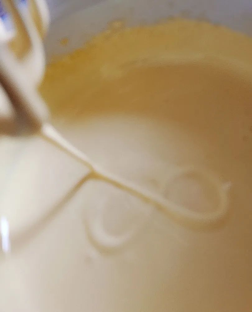 1. 蛋黄加入柠檬汁打发到提起打蛋器缓慢滴落纹路缓慢消失的状态,参考下图。打蛋黄的时候预热好烤箱。