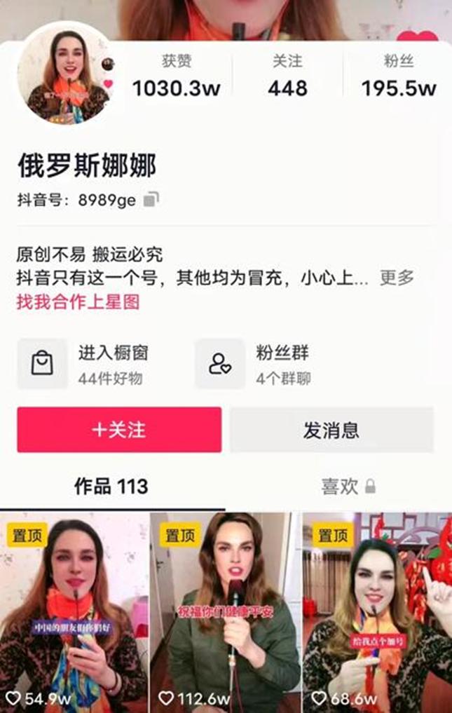 “俄罗斯娜娜”在抖音的粉丝数达到了195万,