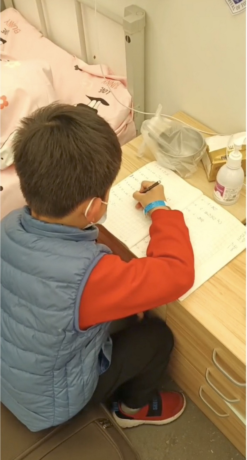 为了让孩子们能够认真学习,家长和医务工作者尽量将自己的声音调至“最轻”状态,孩子们拿着电子设备,认真倾听着网络段老师们的远程授课,时而举手回答问题,时而奋笔疾书……下课休息的时候,孩子们还会“串串门”,彼此问问来自哪个学校,大家互相加个微信。有些低年级的孩子,还拿着解答不出的题目,请教病区里的高年级“学长”。