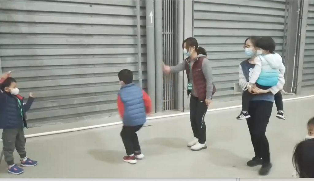 家长志愿者带着孩子们到空旷区域跳绳