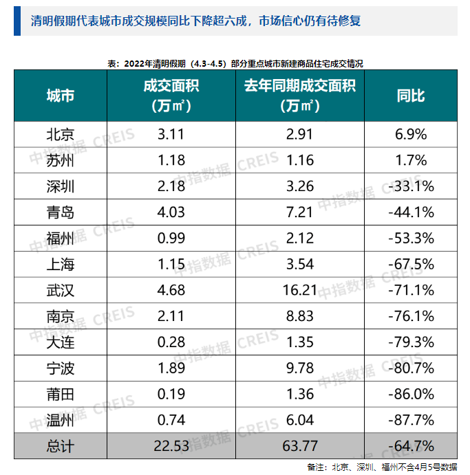 4月6日,根据中指监测数据,2022年清明假期期间(4月3日-4月5日),重点监测城市新建商品住宅成交面积同比下降64.7%。其中北京、苏州等热点城市市场活跃度提升,购房者置业信心有所恢复,新房成交规模同比小幅增长,其余代表城市受疫情反复或置业信心不足等因素影响,成交规模同比均呈不同程度下降,其中武汉、南京、大连、宁波同比下降均超七成。
