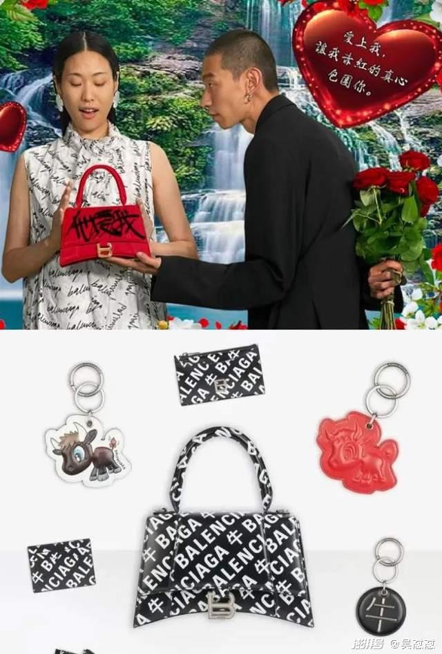 滑稽派的有Balenciaga 2020年七夕的经典之作——中文手包。宣传片采用千禧年杀马特的低成本特效,包上简单粗暴地印着几个大字「你爱我」、「他爱我」、「我爱我」。