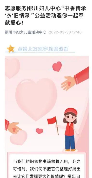 1.3月30日,银川市妇女儿童活动中心开展“书香传承 ‘衣’旧情深”爱心募捐志愿服务活动。