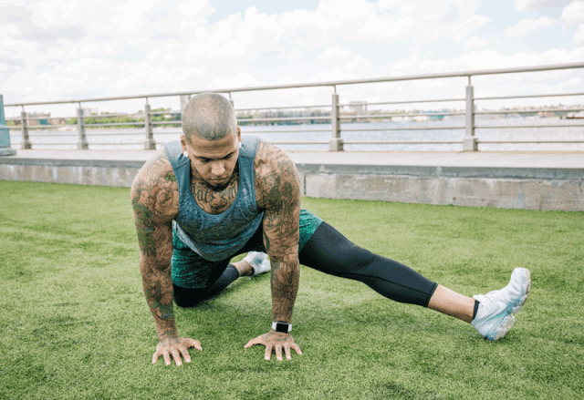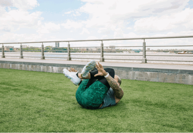 动作要领:从直臂平板支撑开始,手腕在肩膀下方,收紧核心集群,把左脚放在左手外侧,同时把左手绕过左脚的后面,并放在左侧(这有助于你比传统的髋关节拉伸得更加彻底),接着将身体重心向左侧移动,同时保持右脚在原地。