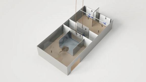 魟鱼的实验装置:1.起始盒 2.实验区 3.闸门 4.有展示图形的门 5.决定区 6.图形选择卡。施普林格·自然 供图它们被放置在61cm×31cm×31cm的实验容器中。