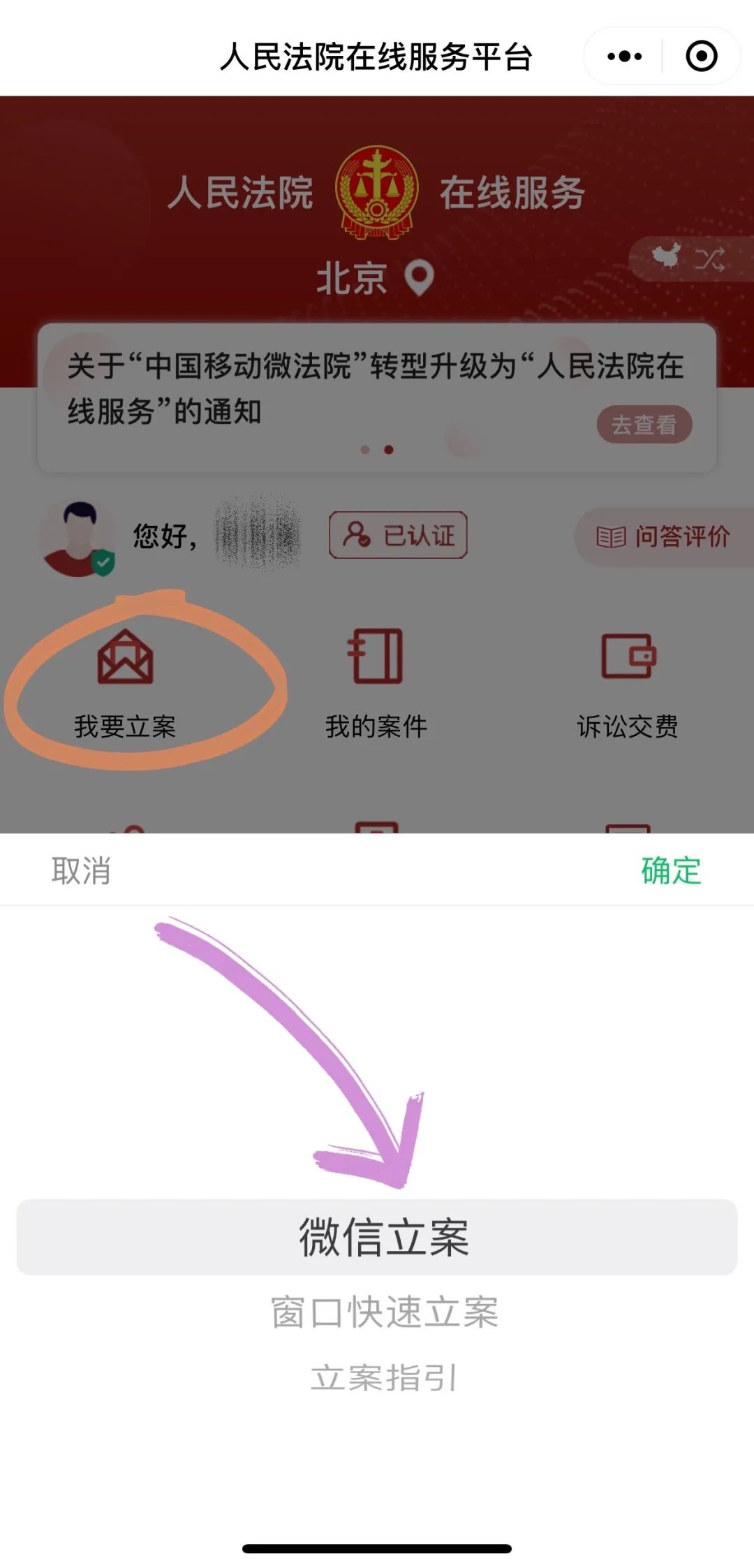 选择“微信立案”,