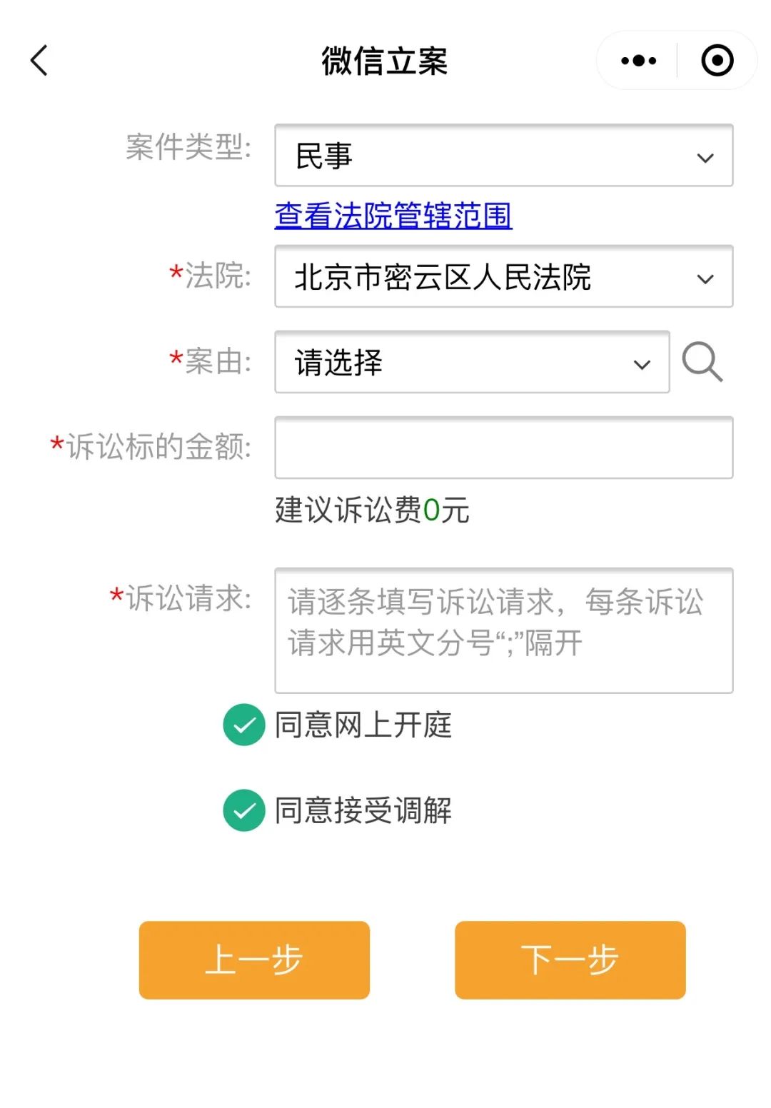 选择法院、案由,填写诉讼标的金额、诉讼请求,