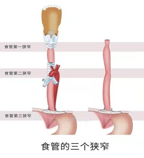 食管的第一个狭窄位于食管的起端,即咽与食管的交接处,距门齿约15cm,异物卡在此处时颈部可有明显异物感,约超过60%的食管异物发生在此处,是食管异物最容易滞留的位置。食管的第二个狭窄距门齿约25cm,由主动脉弓从其左侧穿过和左支气管从食管前方越过而形成,异物卡在此处时可有胸部异物感或疼痛感,该部位是食管内异物存留最危险的位置,尤其需要注意。