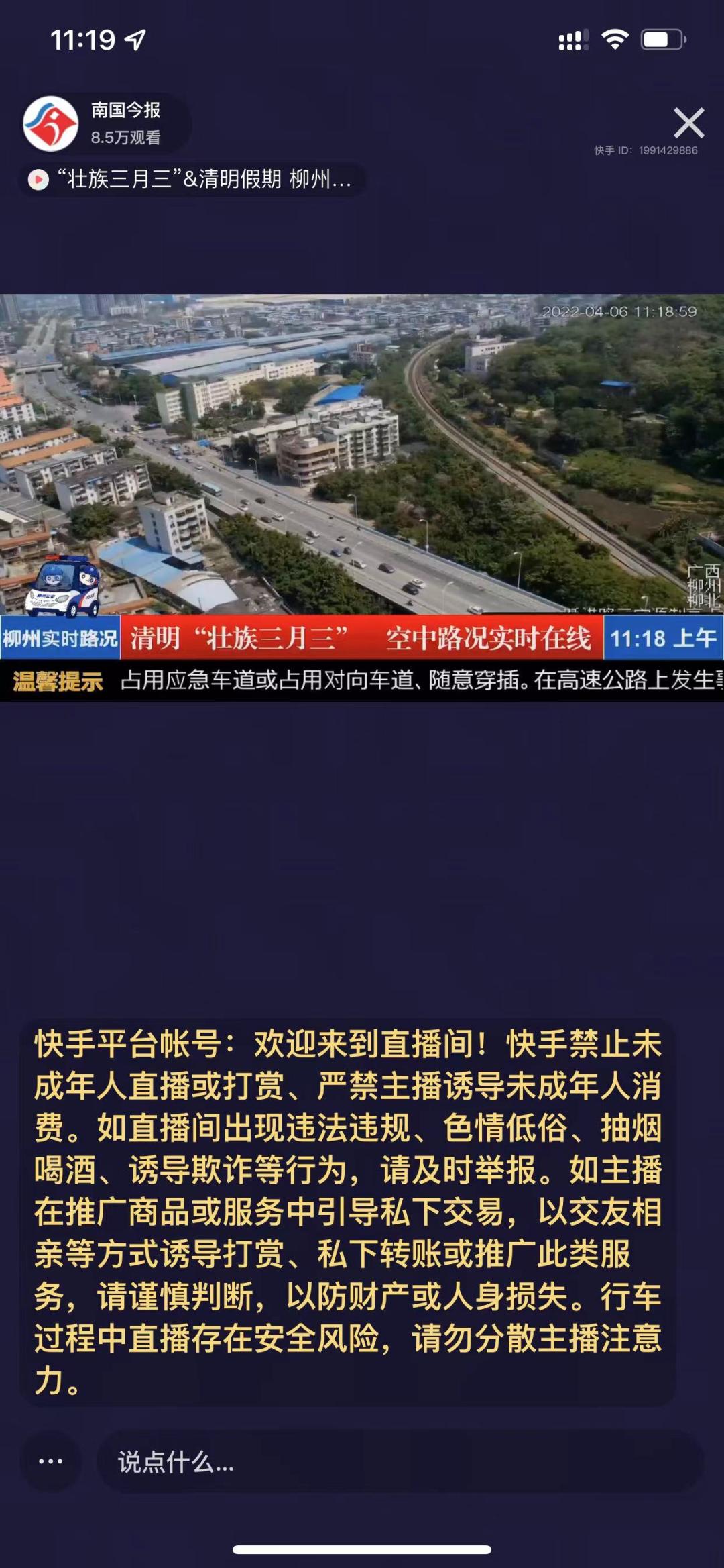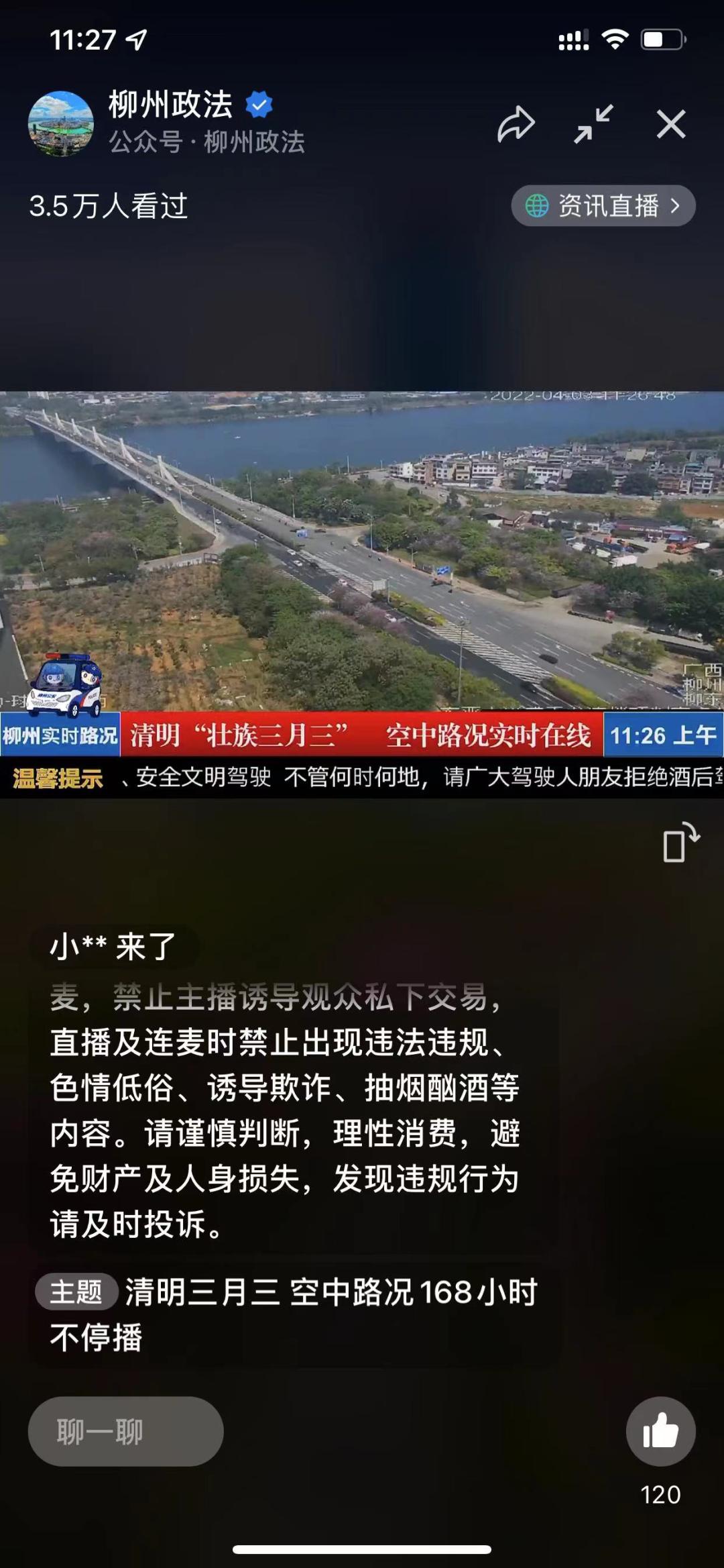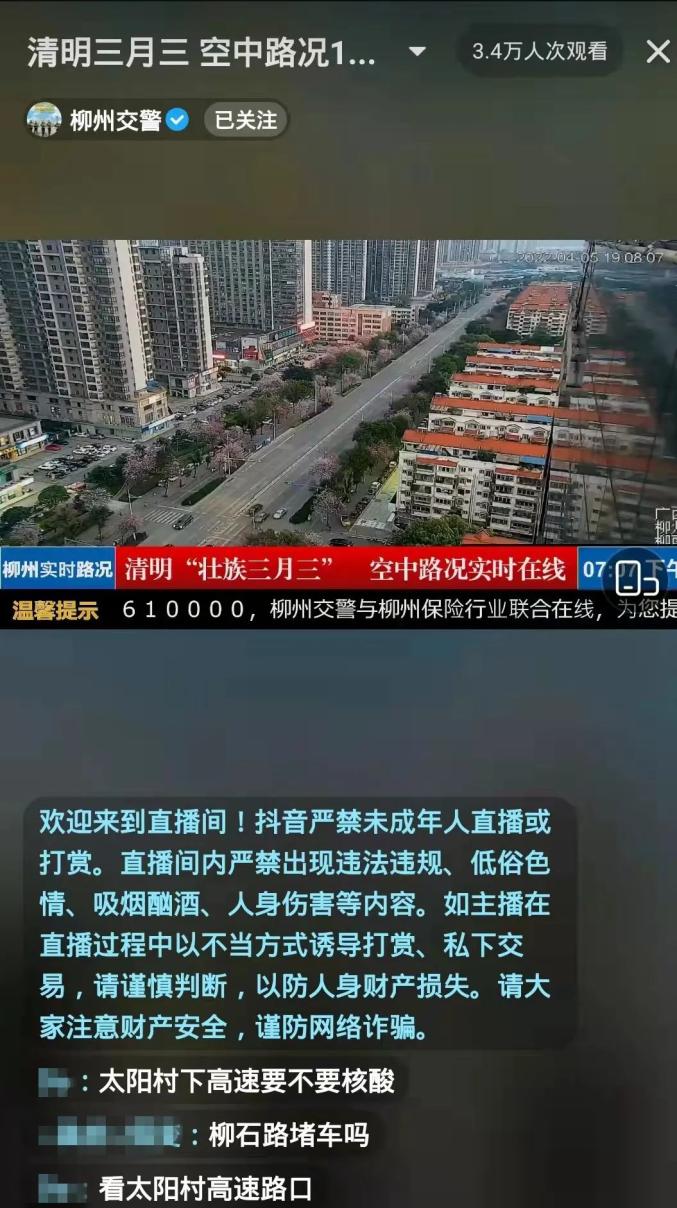 4月1日至4月7日,柳州政法联合柳州警方和柳州交警在微信视频号、抖音、头条号、快手号等平台开设全天实时路况直播:从空中鸟瞰高速车流到指挥中心播报车流高峰,从清明祭扫路况实时更新到假期反诈防范提醒,168小时不间断播报。