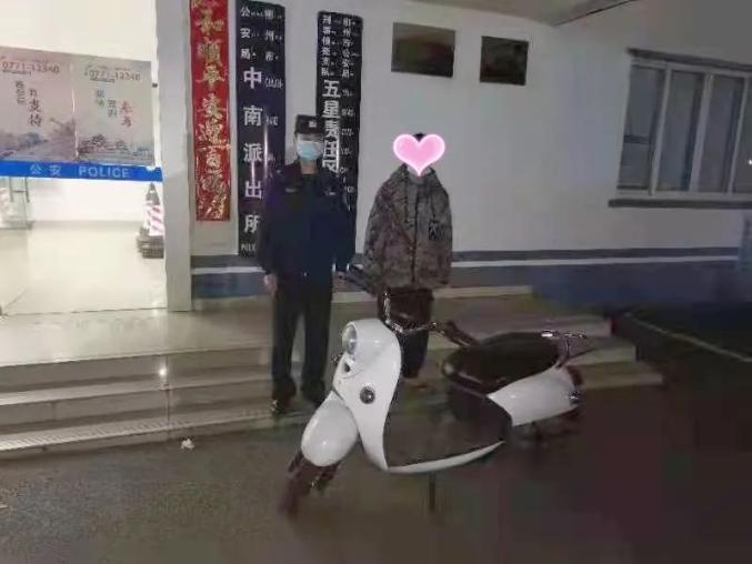 4月2日9时15分许,中南派出所民警接到市民张先生报警称,其停放在柳州市城中区曙光西路北一巷某出租房内的白色电动车被盗。中南派出所民警接报后立即开展侦查,警方于当天晚上20时许在滨江西路附近找到盗窃嫌疑人暂时停放在该处的被盗车辆,随后致电张先生前来派出所取回电动车。强化服务,确保群众安全过节