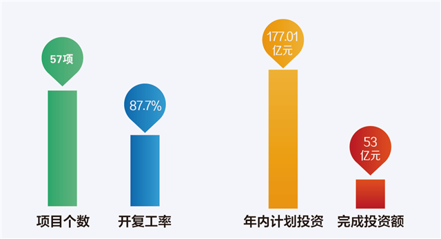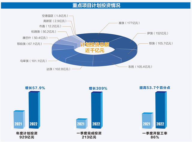 2022年,准格尔旗计划实施重点项目57项,总投资715.33亿元,年内计划投资177.01亿元。截至目前,开复工50项,开复工率87.7%,完成投资53亿元。