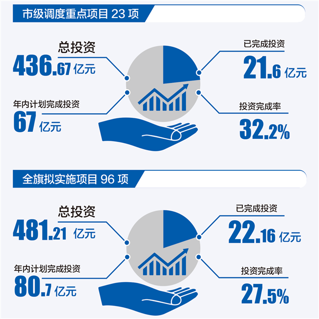 2022年,鄂托克前旗计划实施重点项目96项,总投资481.21亿元,年内计划完成投资80.7亿元,截至目前,已开复工项目41项;已完成投资22.16亿元。其中,计划实施市级重点项目23项。