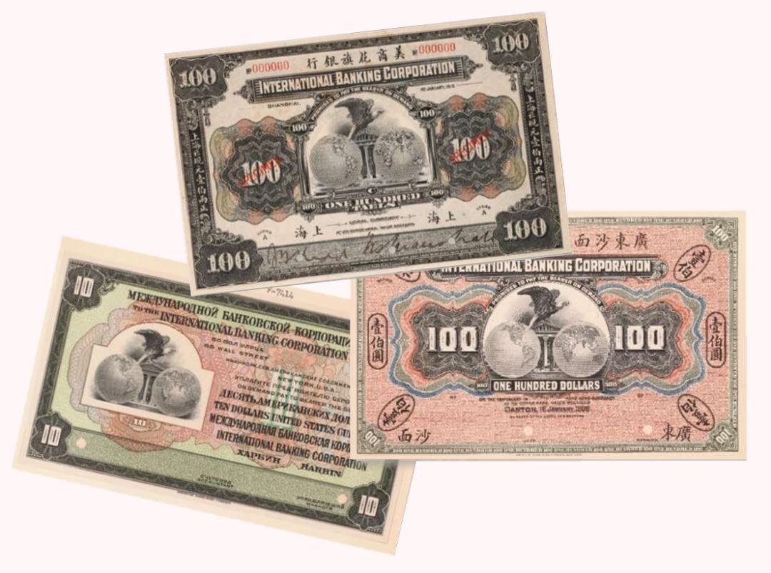 花旗银行为美国商办股份制银行,在香港亦称广东沙面万国宝通银行。创办于1901年,总行设于纽约,次年1月在上海设立分行,继而又在香港、广州、北京、汉口、天津等城市设立分支机构。花旗银行是美国最先在国外设立系列分行的银行,肩负着与当时独占外国汇兑总利益的英国海外银行在东方竞争的使命。该行在华除经营一般商业银行业务外,还享有经理关税和粤汉铁路建筑等特权。花旗银行从1907年开始在华发行纸币。上海九八规元壹佰两纸币是1918年由美国钞票公司印制,正反两面均采用该行的标志性图案——鹰与地球,这是该行发行面额最大的银两票。值得关注的是,1909年版的广东沙面地名壹佰元和1923年版的哈尔滨地名拾元均未见流通券存世,因此它们的票样显得格外珍贵。