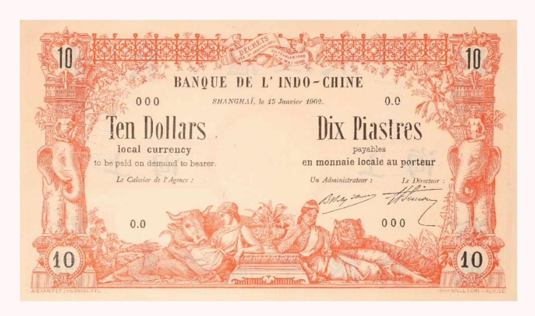法国东方汇理银行创办于1875年,由法国的社会实业银行、巴黎荷兰银行和巴黎商业银行等联合投资组建。该行总行设于法国巴黎,分支机构遍布于印度支那半岛各大中城市,成为法国经营印度支那的金融机关。1888年,该行将业务扩展到中国,翌年在广州沙面法租界开设广州分行。1894年,开设香港分行。1899年在上海设立分行。其业务以进出口押汇为主,存放款为次。20世纪初,东方汇理银行发行过上海地名券。因该种上海地名券发行量极少及银行信誉良好,大部分发行的钞票己回收销毁等原因,长期以来不见其实物踪影。该枚东方汇理银行上海地名券拾元面值纸币票样,印刷精美,全新品相。票样正面为黄色图案底纹和黑色中文“东方汇理银行”行名、“上海”地名和“拾元”面值。背面为红色图案,印有英、法两种文字的面值和通行条例。最上方印有法文“东方汇理银行”行名,下面是该票发行的日期和地点:“1902年1月15日于上海”。最下面还有一幅古印度神话中二位女神的图像。该票存世仅发现二张,为洋商客钞中的珍品。