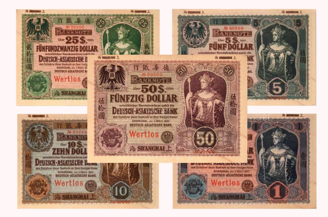 德华银行由德国13家银行和企业合资创设,于1890年1月1日在上海正式开业,是德国资本在华活动的中心机构,并在北京、天津、青岛、汉口等地设立分行。1907年德华银行开始在华发行纸币,所发纸币正面右侧是手持长矛和盾牌的德国武士半身人像,左侧上下分别为象征德国的站鹰和清帝国的蟠龙图案。该套德华银行上海地名票样共9枚,包含壹两至贰拾两的银两票和壹元至伍拾元的银元票。由德国莱比锡吉斯克·德夫罗依特公司印制,票面凿有针孔状德文“票样”,另加盖英文票样字样。由于德华银行发行纸币数量不多,当年回收彻底,所遗留票样极为少见,这套完整的上海地名银两票和银元票的完整票样为目前仅见。原标题:《云赏乾坤 丨银行博物馆“精品掌上看”之典藏纸币(二)》