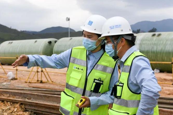 ▲3月16日,吕梦圆(左)和总工程师张青华在化粪池施工现场讨论方案。即使做足了措施,淤泥的挤压仍然强烈,基坑的形变也随时可能出现。吕梦圆和总工程师张青华不得不几次更改施工方案。